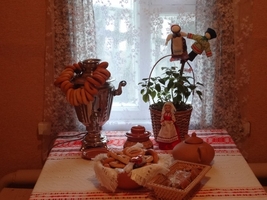 Не успели мы войти в этот дом, нас сразу же пригласили на чай. Это такая традиция — собираться за столом, есть бублики, конфеты и чаевничать из настоящего самовара. Всё как в истинно русской избе-половики повсюду, деревянные лавочки, вышитые салфетки, даже вот эти куклы-для наших предков такие были оберегом, символом любви и плодородия. Как у этой хрупкой девушки, хозяйки дома, родилась идея собрать всё это, она не помнит. Говорит, что просто всегда любила русскую культуру и знала, что будет возрождать её, изучая старинные ремесла и художественные промыслы.