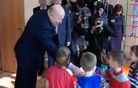 Все начинается с рукопожатия, Еще бы, четыре года -солидный возраст. Посмотреть, как устроились маленькие новоселы приехал серьезный гость — губернатор. Четырехлетние дамы всю солидную компанию приглашают на праздник.