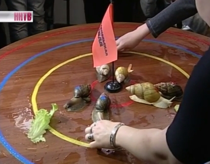 Отличительная черта этих состязаний - можно употреблять допинг: морковка, салат и свежие огурцы. Без этого дистанцию в 44 сантиметра осилить почти невозможно. Всего в забеге участвуют шесть улиток ахатин. Борьба, конечно, не самая зрелищная. Так что победителя приходится терпеливо ждать.
